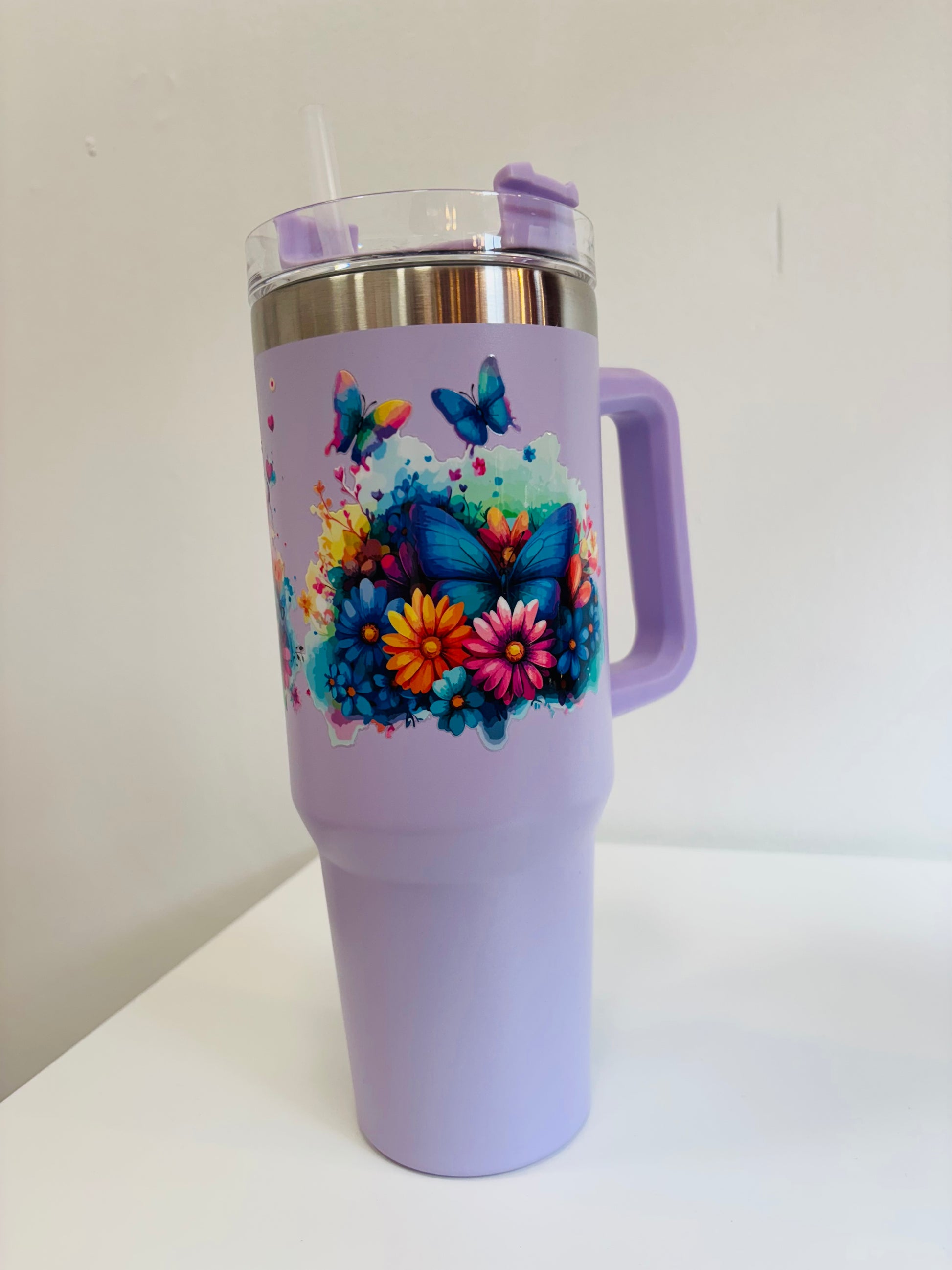 This gorgeous lavender Stanley-style tumbler features a vibrant butterfly and wildflower design that brings instant joy to your daily routine. Whether youβre sipping your morning iced latte or staying hydrated through the day, this cup keeps your drinks at the perfect temperature for hours.