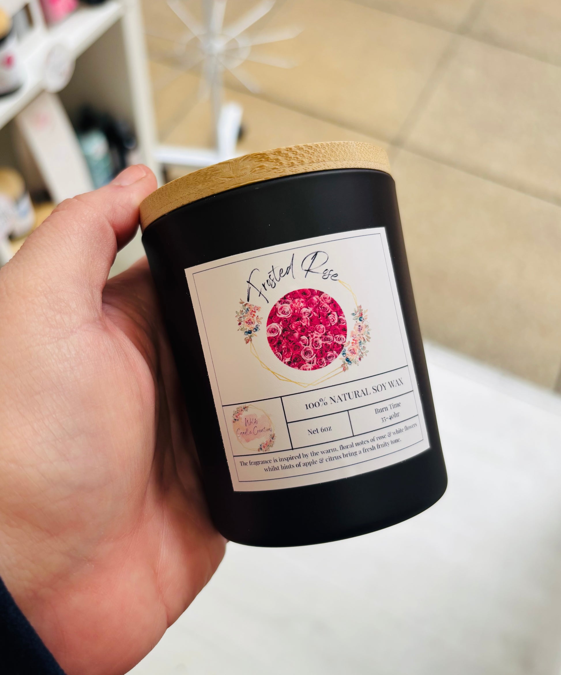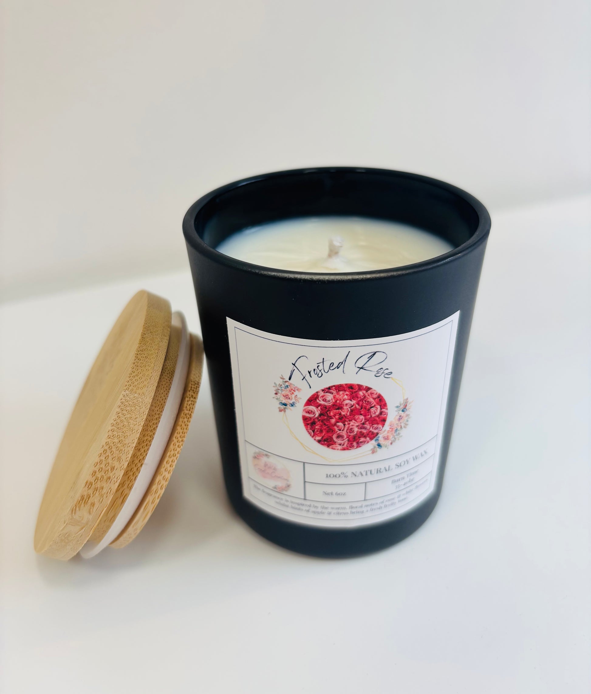 Frosted Rose Soy Candle | Black Jar with Bamboo Lid | Hand-Poured 6oz